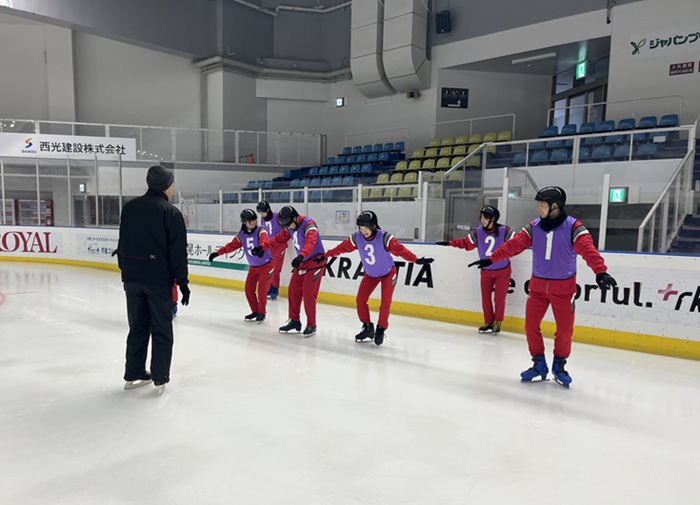 2日目以降は、グループごとに後方滑走やカーブ滑り、クロスやジャンプなど、より高度な技術の習得を目指して行われました。またグループを超えた学生同士での「教え合いの時間」を設けることで、自身が習得したスケート技術をアウトプットすることができ、より能動的な学習となるとともに指導法への理解も深まりました。