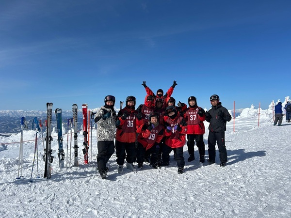 はじめは慣れなかった学生も着実にスキー技術を向上させていき、滑走時の表情も余裕あるものに変化していきました。頂上にたどり着くと、展望台に登り、班のみんなで記念撮影を行いました。今年度はどの期間でも1日は頂上の天候がよく、樹氷を見ることができ、壮大な蔵王の山脈を拝むことができました。