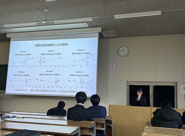 発表会場の各教室では、4年生が1年間かけて取り組んできた研究内容に対し、1・2・3年生から活発な質疑応答が行われました。発表した4年生のみならず、聴講した学生にとっても非常に有意義な時間となりました。